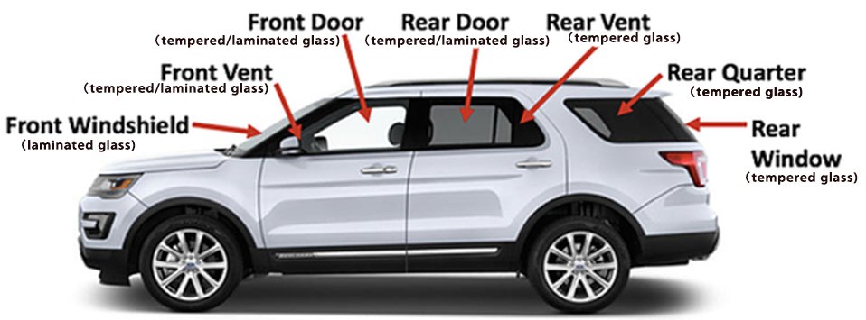 Front windshield (laminated glass) / Front vent (tempered /laminated glass) skylight (tempered/laminated glass) / Front door (tempered/laminated glass)